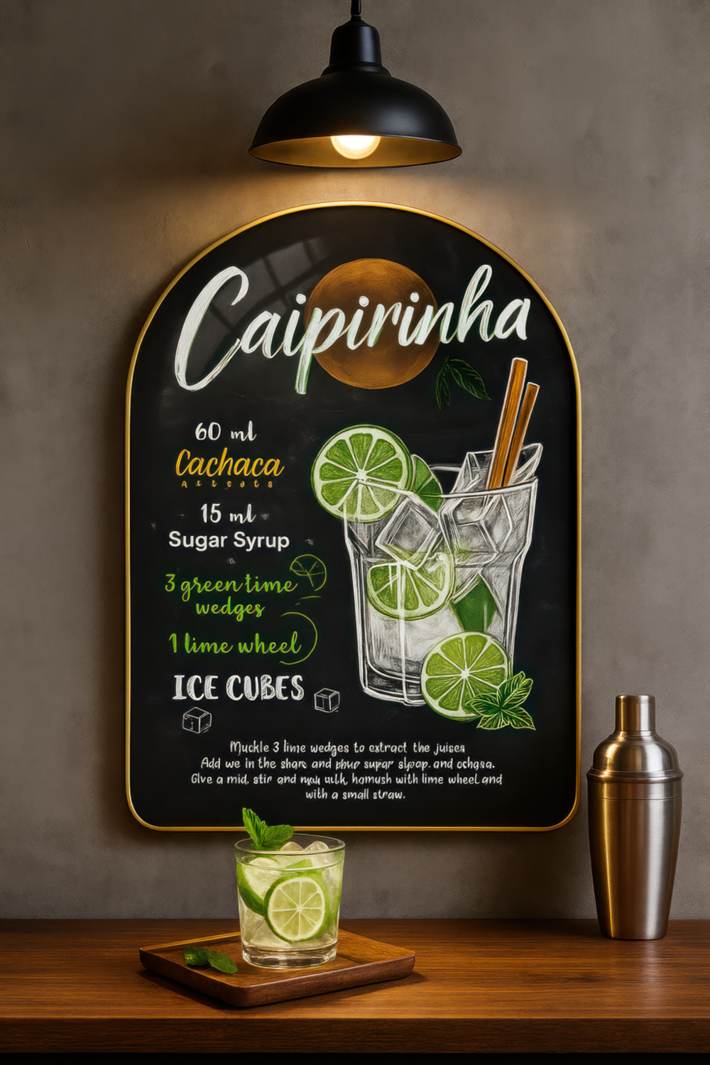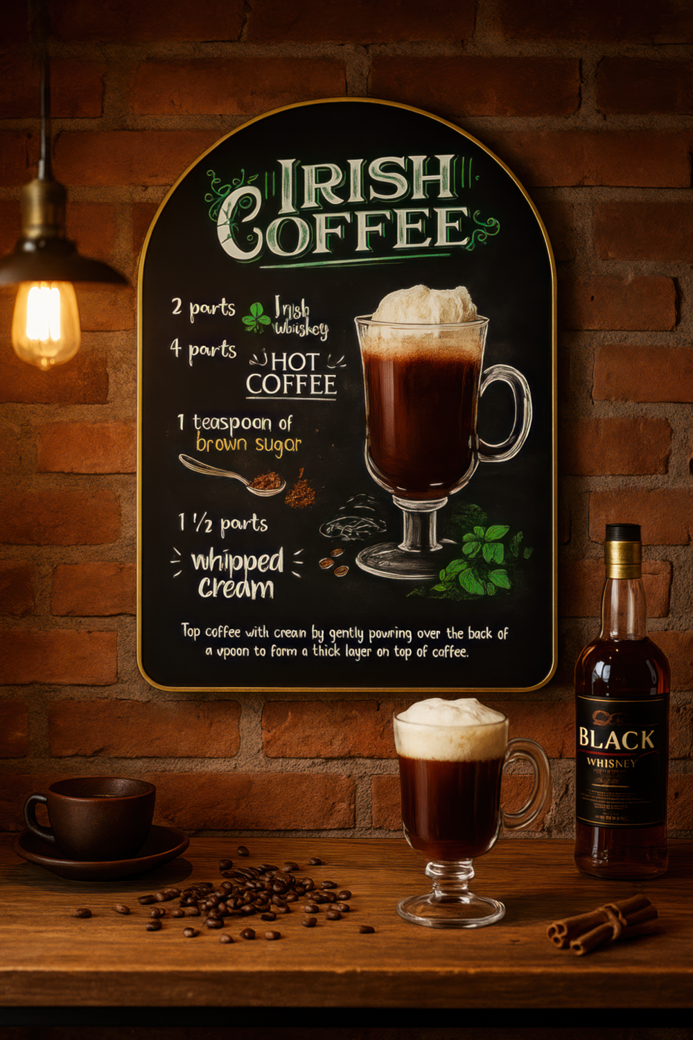 ดีไซน์สวยงามและทันสมัย: กรอบรูปทรงโค้งมนสไตล์วินเทจ พร้อมลวดลายอาหารและเครื่องดื่มที่วาดด้วยมือ (hand-drawn) อย่างประณีต ให้ความรู้สึกเหมือนกระดานชอล์กแต่ดูหรูหรากว่า