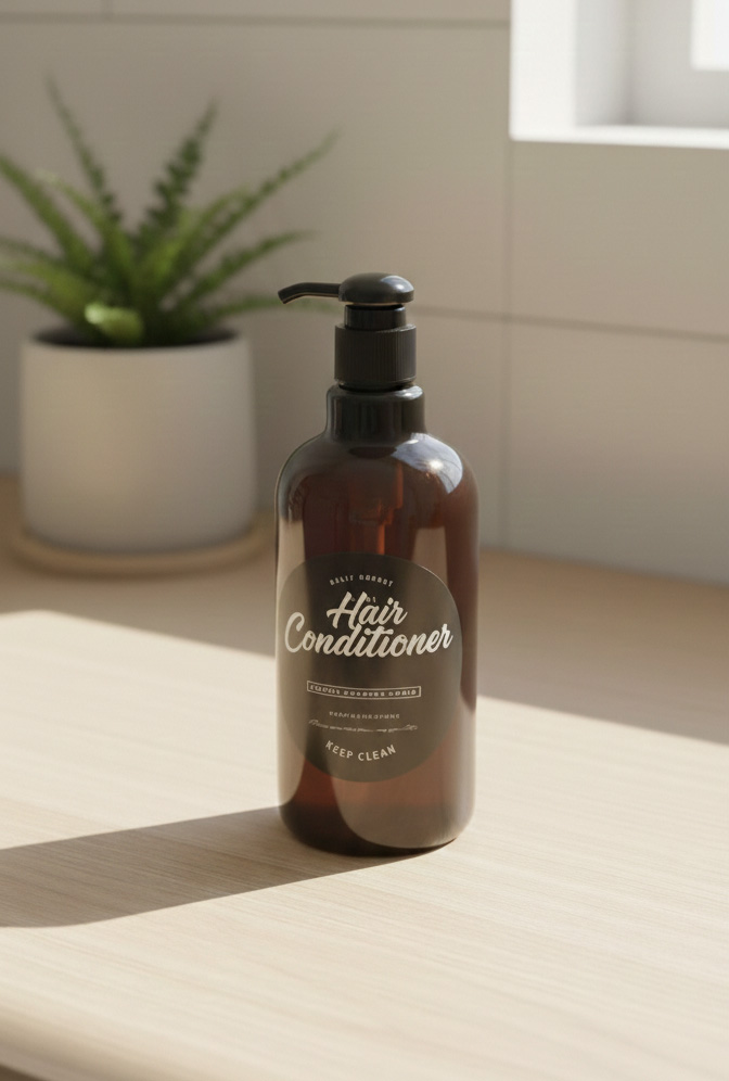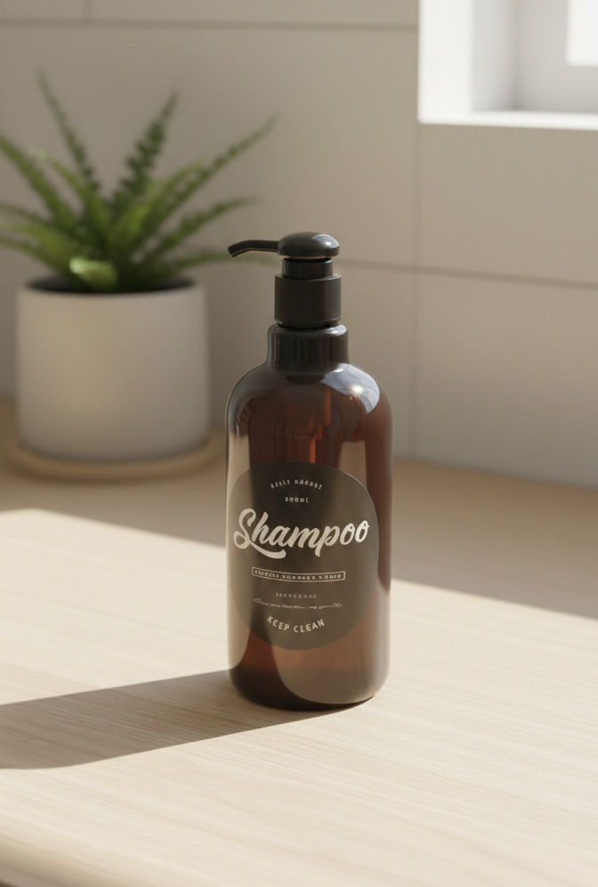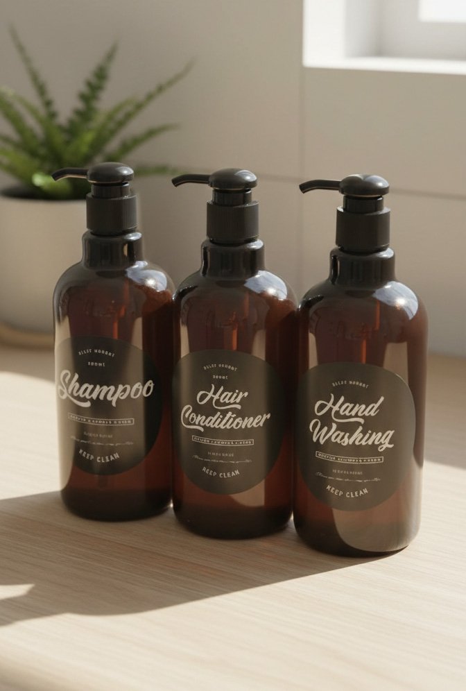 ขวดพลาสติก PET สีชา (Amber) ขนาด 500 ml พร้อมหัวปั๊มสีดำ ดีไซน์พิมพ์ตัวอักษรสีขาว แยกประเภทการใช้งาน Shampoo, Hair Conditioner และ Hand Washing ให้ลุคเรียบหรู สไตล์มินิมอล เหมาะสำหรับจัดห้องน้ำ บ้าน คอนโด โรงแรม หรือร้านสปา
