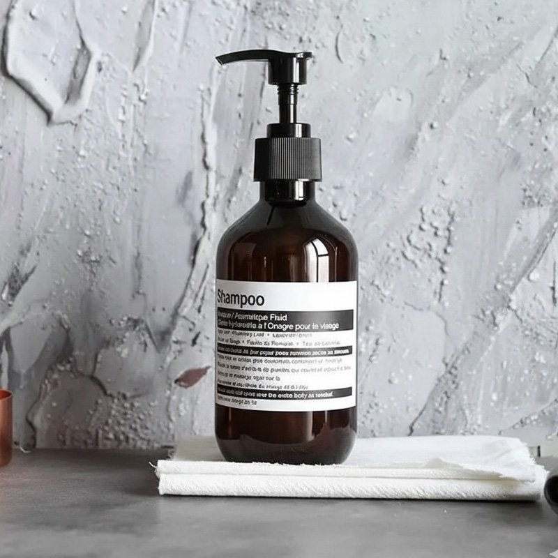 ขวดพลาสติก PET สีชา (Amber) ขนาด 300 ml พร้อมหัวปั๊มสีดำ ดีไซน์ฉลากสไตล์มินิมอล ตัวอักษรชัดเจน ให้ลุคเรียบหรูแบบร้านสปา คาเฟ่ และโรงแรม